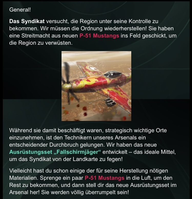 Um die benötigten Utensilien zu bekommen, muss man die P-51 Mustang Maschinen zerstören und dann die Wrackstellen "farmen".