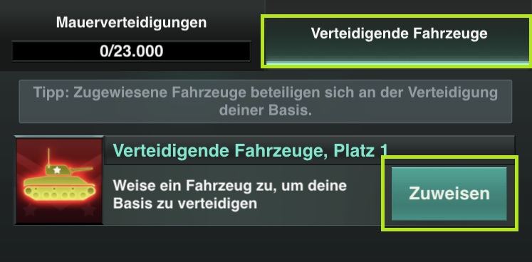 Allerdings ist ein der Mauer zugewiesenes Fahrzeug nicht für einen Angriffsmarsch verfügbar. Möchte man dieses dann nutzen, muss man zuerst die Zuweisung wieder aufheben.